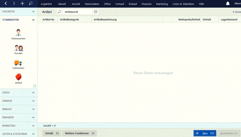 Wenn Sie einen neuen Online-Shop aufgesetzt haben und darin noch keine Artikel gespeichert sind, erstellen Sie zunächst einen Testartikel mit einer Artikelnummer (SKU). Dies ist für den weiteren Export von Artikeln unumgänglich, da MeinBüro und orgaMAX immer erst einen Vergleich anstoßen, bevor eine Synchronisation stattfindet. Wird kein Artikel gefunden, erhalten Sie eine Fehlermeldung.
