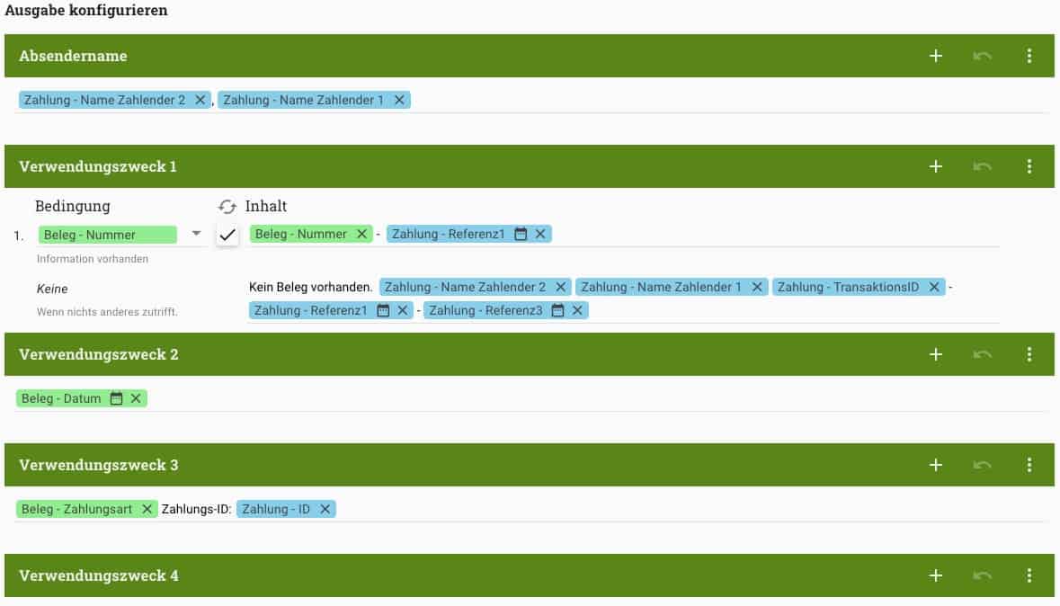 Am Ende erhält man die Möglichkeit, sich den Verwendungszweck, der schlussendlich in der Buchhaltungssoftware auftaucht, aus vielen Variablen selbst zusammenzubauen. Dabei kann man auch modular und anhand von Bedingungen vorgehen: